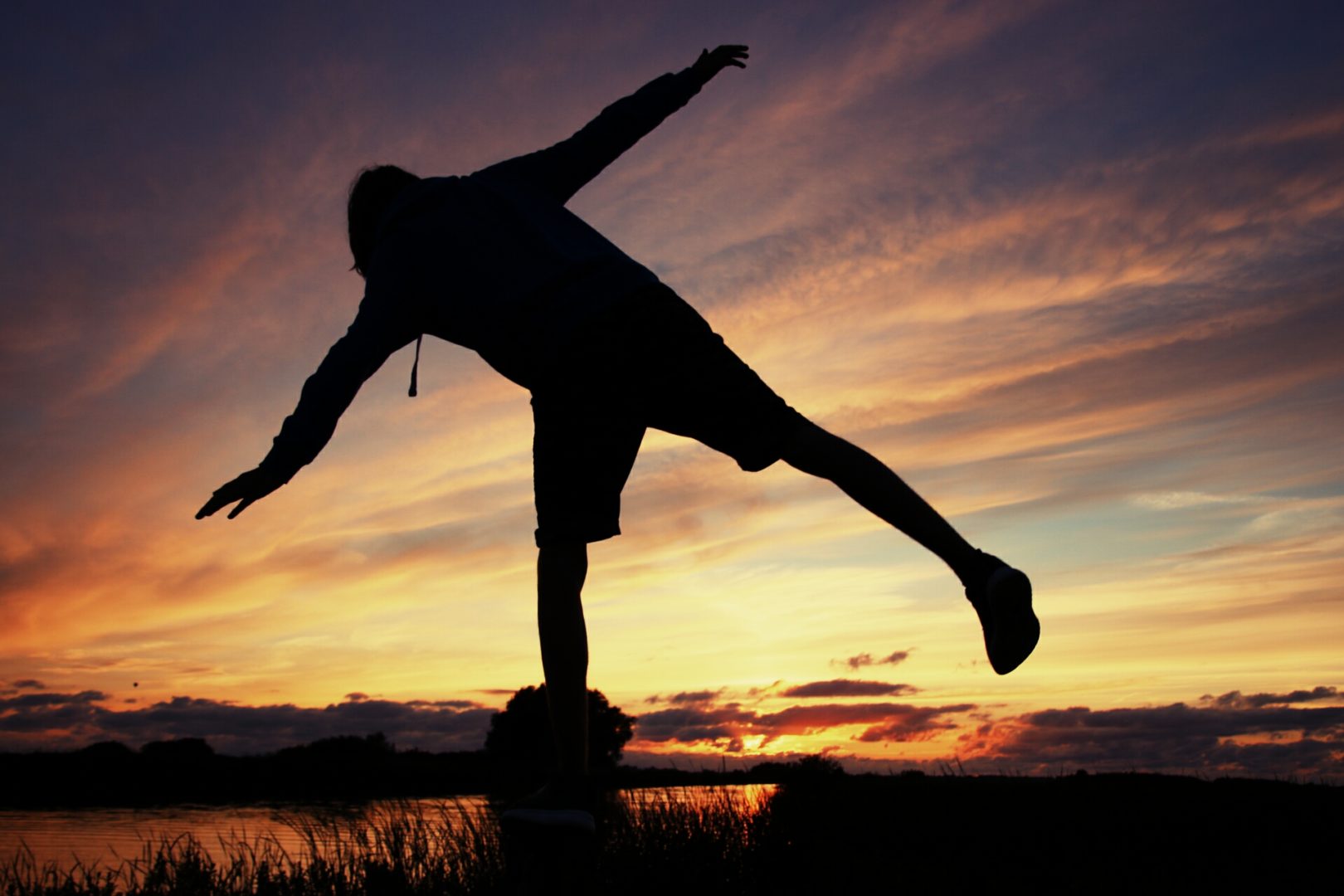 In de zonsondergang balance houden op het hek.